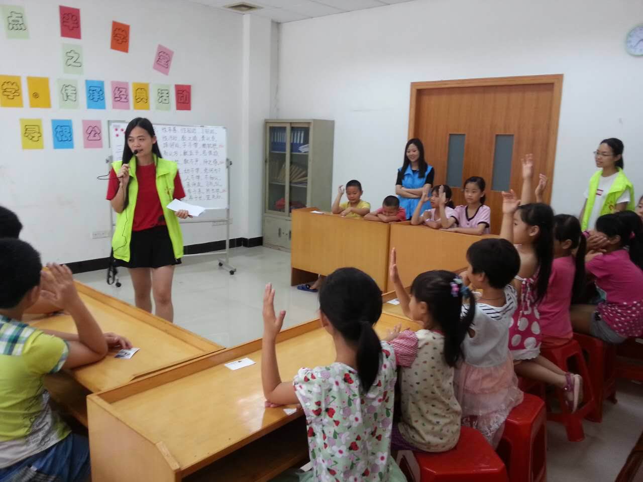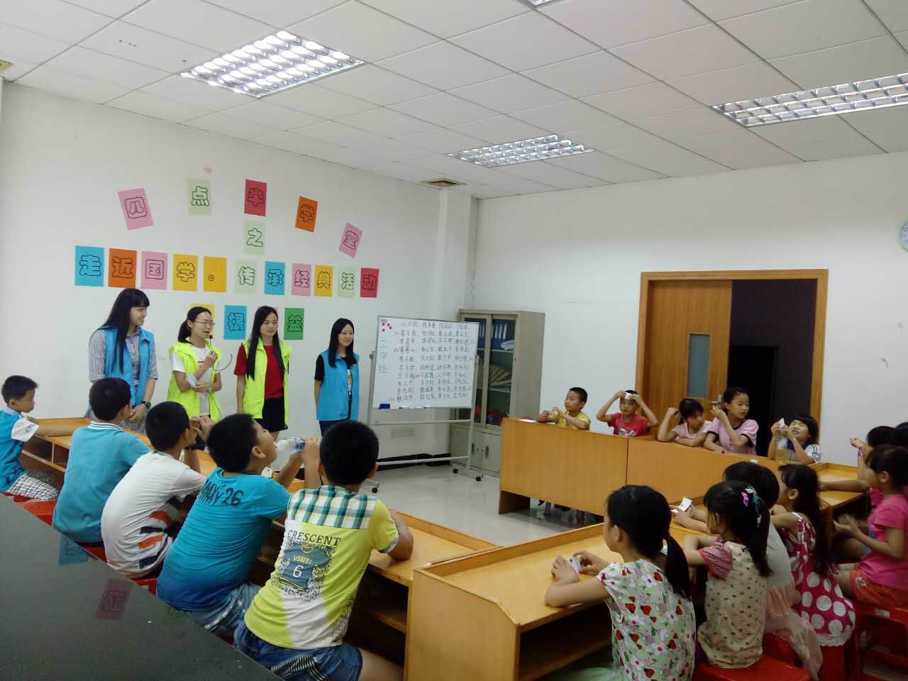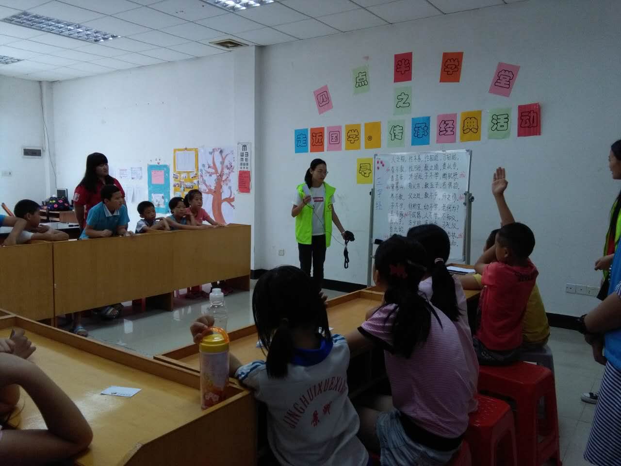 2016年5月21日下午三点整,由9428cn太阳集团古天乐榕树志愿服务队成员黄肇仪、张秀琪、徐丽娟、梁琪和乐雅驻黎滘村社工叶敏英举办的以“寻根”为主题的国学公益小课堂正在黎滘村火热地进行。虽然国学活动已经进行到中后期,但孩子们好学的热情依然不减,即使天气十分炎热,他们也积极地配合志愿者们。