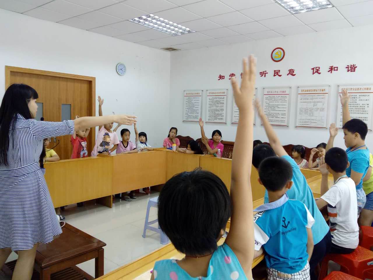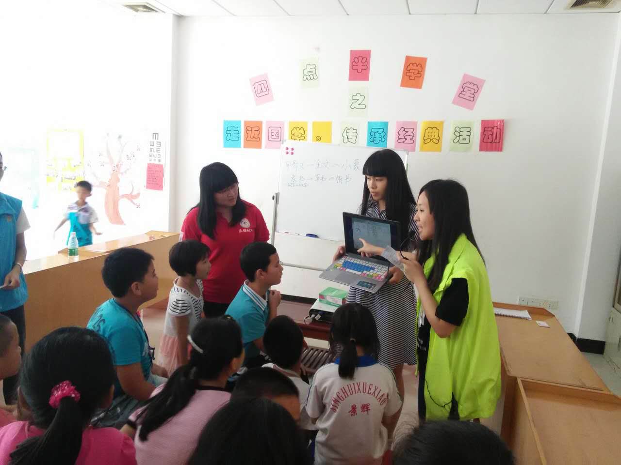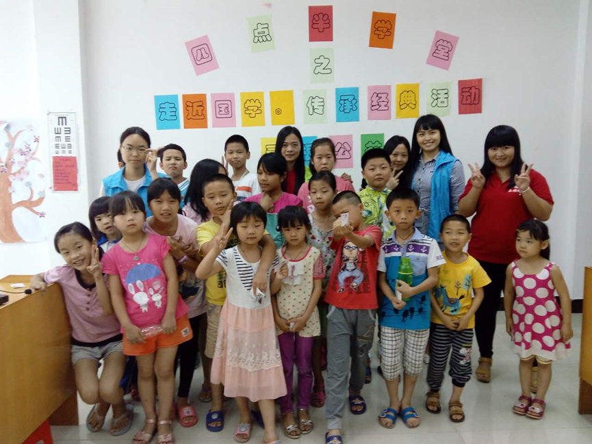 2016年5月21日下午三点整,由9428cn太阳集团古天乐榕树志愿服务队成员黄肇仪、张秀琪、徐丽娟、梁琪和乐雅驻黎滘村社工叶敏英举办的以“寻根”为主题的国学公益小课堂正在黎滘村火热地进行。虽然国学活动已经进行到中后期,但孩子们好学的热情依然不减,即使天气十分炎热,他们也积极地配合志愿者们。