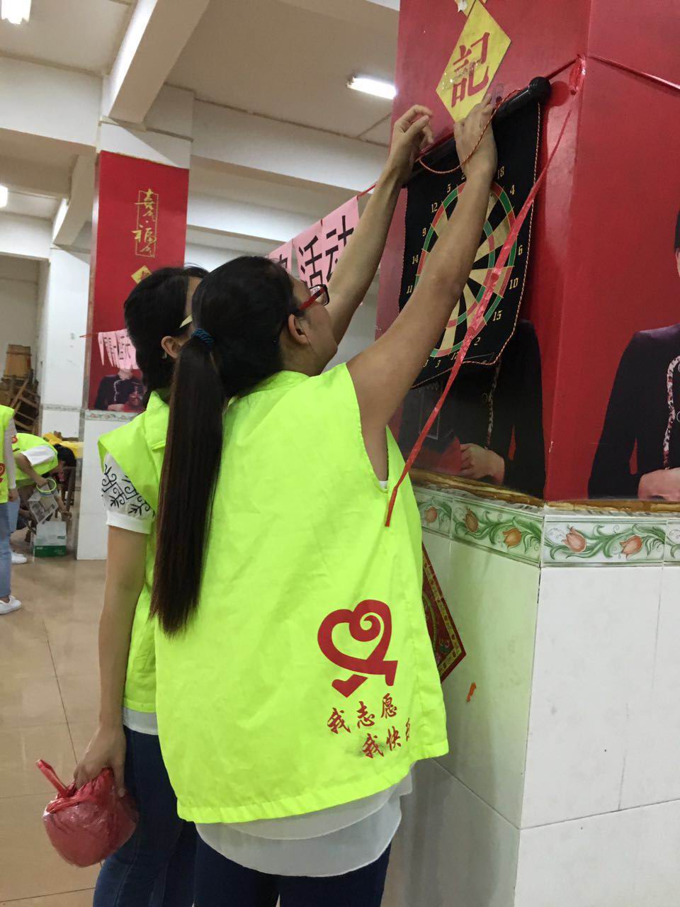 社工婷姐给志愿者们分发了物资后,志愿者们开始布置场地。我们在大盛村礼耕书院门口挂上“‘共享一片蓝天’之2016年大盛村残疾人联谊活动”的卡纸横幅。本次活动的游戏有三个,分别是掷飞镖、钓鱼和抛圈圈。