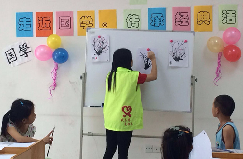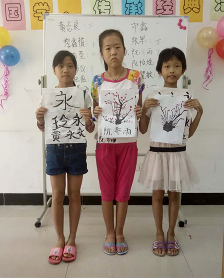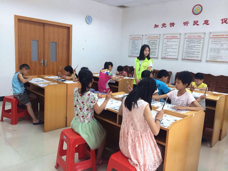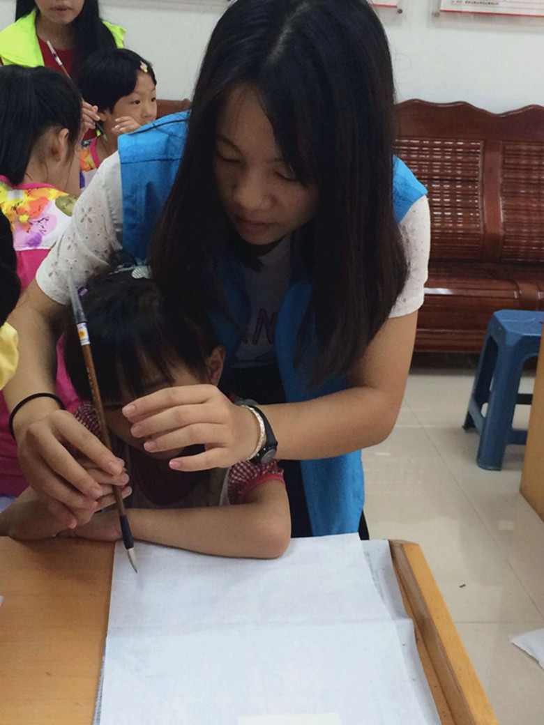 图2 志愿者教孩子们写毛笔字