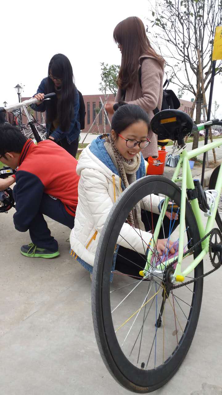 顶着料峭的春风,同学们早早地在新饭堂门前做好准备。人们都行色匆匆地赶去上课,场面暂时显得冷清。早上10点15分左右,不少人陆陆续续向新饭堂走来。第一个前来打气的人走近,志愿者们按捺不住心里的兴奋,迅速迎了上去,一个同学去拿抹布,一个同学去沾湿抹布,一个同学负责打气,还有一个同学帮忙按住气阀……共同做好第一次的“服务”。将近中午11点的时候,我们迎来了就餐的小高峰。“给你的宝马擦身打气”这个横幅吸引了不少同学的注意。随着人流量的逐渐增多,志愿者们开始主动走向那些骑着自行车的人,礼貌而热情的向他们介绍该活动,邀请他们过来体验。到了中午12点,人们已经是络绎不绝的向饭堂走过来,不少的人也骑着自行车从我们面前经过,越来越多的同学关注到我们的摊位,有的同学在一旁好奇的观望我们的活动,有的同学上前询问,有的同学推着自行车来打气……渐渐地,来到我们摊位面前的人越来越多,一辆一辆的自行车整齐地摆放着等待我们的擦洗。志愿者们信心满满地开工,有的同学拿着抹布手脚飞快的上下舞动,有的人拿着打气筒将气打得虎虎生威。每当有一个需要“保养”自行车的人靠近,同学们都会拿着抹布围了上去,引导车主在合适的场地停放自行车等待擦洗,而车主们也在一旁耐心的等待。即便后面的人越来越多,场面还是秩序井然。有个女孩推着刚刚擦洗好的充满气的自行车离去,回过头来爽朗一笑,比着大拇指对我们说“9428cn太阳集团古天乐好样的”。这份肯定让同学们喜得眉开眼笑,更是干劲十足。望着周围干的一脸认真,热火朝天的同学们,看着车主们充满信任和善意的眼神,我们每个人脸上都是洋溢着欢乐的颜容。