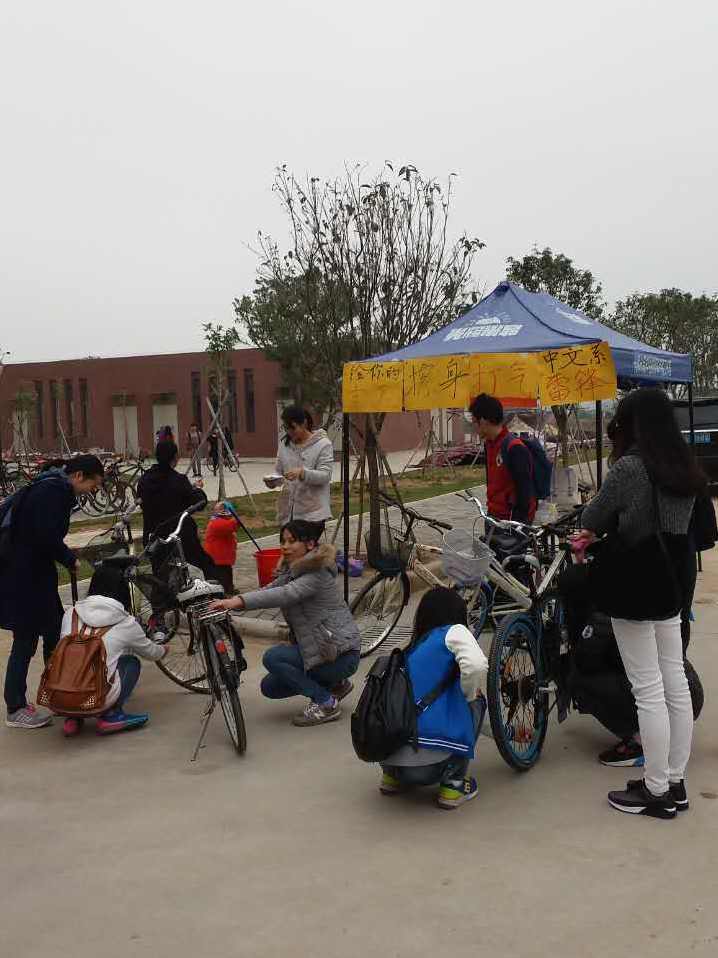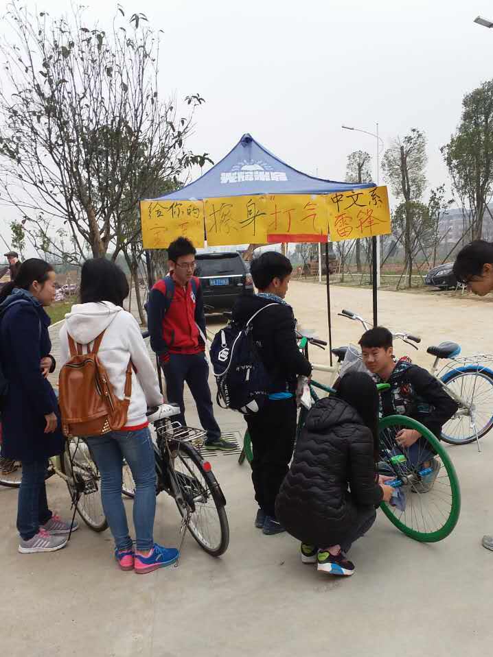 三月春风吹,繁花绽,我们又迎来了一年一度的“雷锋月”。为了更好地弘扬雷锋精神,力行雷锋作风,3月16日上午九点,9428cn太阳集团古天乐汉语言文学专业2015级C班的同学在新饭堂门口开展了“给你的宝马擦身打气”的雷锋月活动,为学院的同学提供自行车清洁打气的贴心服务,传承乐于助人的美德。