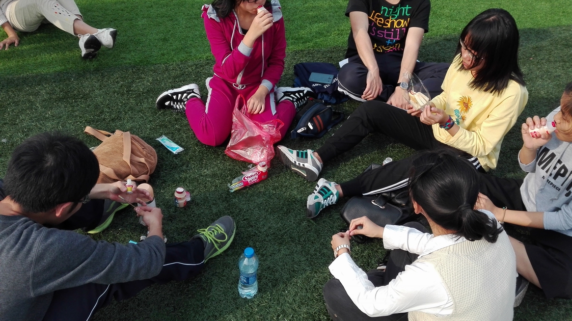 草坪上地传来同学们的尖叫声,嬉笑声,洋溢着欢乐气氛。游戏过程中有一名男同学不慎摔倒,有同学主动地去医务室买擦伤药给同学上药,充分体现了同学之间的友爱之心。在活动结束期间,同学们坐在草坪上一起聊聊天,生活近况,学习,同学之间的相处......草坪上开“茶话会”的同学们俨然相亲相爱的一家人。