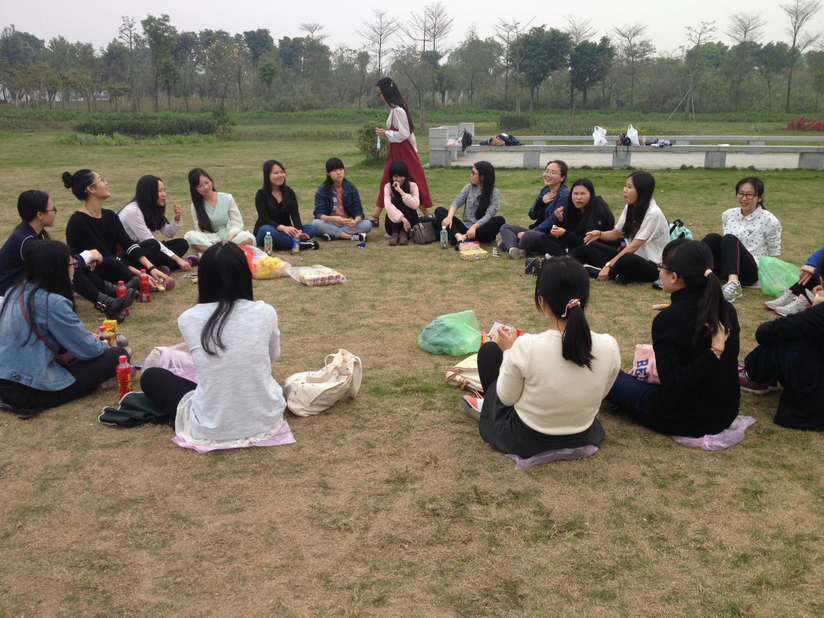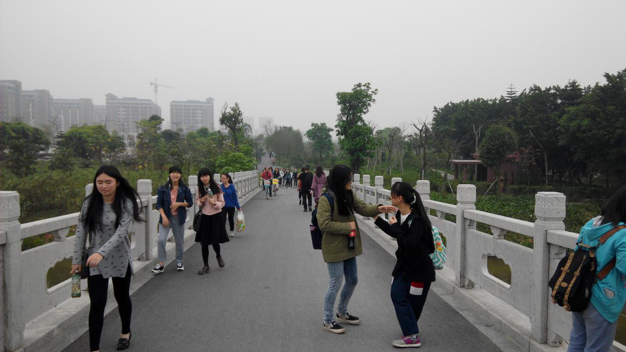 下午2:00,同学们陆陆续续来到我院东莞校区西门集中,待班团干工作人员分发完饮料后,大家有序地进入华阳湖湿地公园。一路上,同学们有说有笑,互相拍照。她们东看看正在发芽的树木,西瞧瞧热情绽放的花朵。最有趣的就要数同学们过桥时候了:有的同学钟情于争奇斗艳的鲜花,有的同学钟情于淳朴古典的建筑,有的同学钟情于碧波荡漾的秀水,有的同学钟情于与同伴相互嬉戏……这些各异的神态动作,活生生像一幅清明上河图。