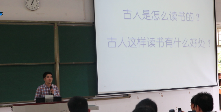 李文杰同学在讲座开始便给同学们播放了几个关于吟诵读书法传承的小视屏,其中包括“汉语拼音之父”周有光的深情吟诵、著名人士张桂光先生《春夜序》的吟诵、韩国小孩和成人的吟诵。有趣的是,李文杰在播放视频的同时描述了视频中各种人物摇头晃脑、酸溜溜的肢体语言,表达了口耳相传的“诵、吟、唱”,表现了他吟诵传承中华经典的殷切渴望和热情!