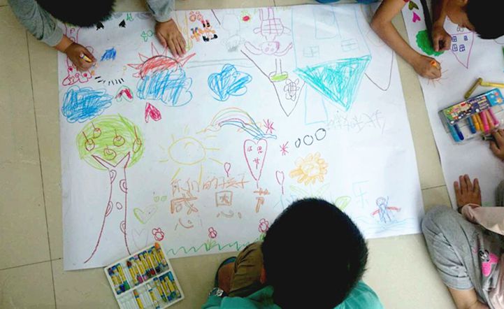 最后,志愿者和英姐一起把所有的画作贴在墙上以供参观,当看着五颜六色的稚嫩的画作时,志愿者们也心生感慨。时光易逝,但还是坚信“天意怜幽草,人间重晚情”,带着感恩的心,回报社会,也感恩孩子们今天为我们送上一堂美好的完满的感恩课。