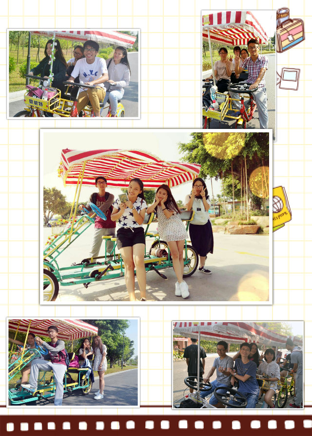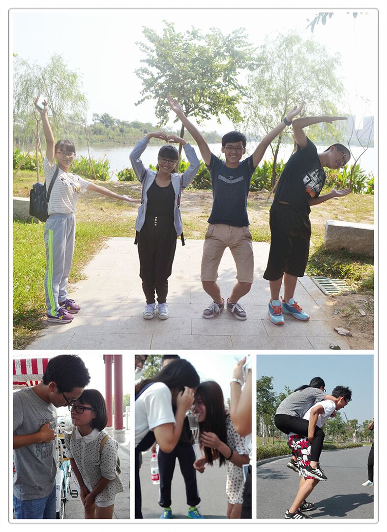 上午9点钟,70名同学在自行车租车处集合,队伍阵容庞大,一路上回荡的是同学们的欢声笑语,熠熠阳光映衬下的是一张张充满活力的笑脸。在组好四人组的小分队后,同学们骑着一辆辆四人自行车,向着华阳湖湿地生态公园驶去,具有2015级C班特色的华阳湖自行车团体竞赛终于开始了。