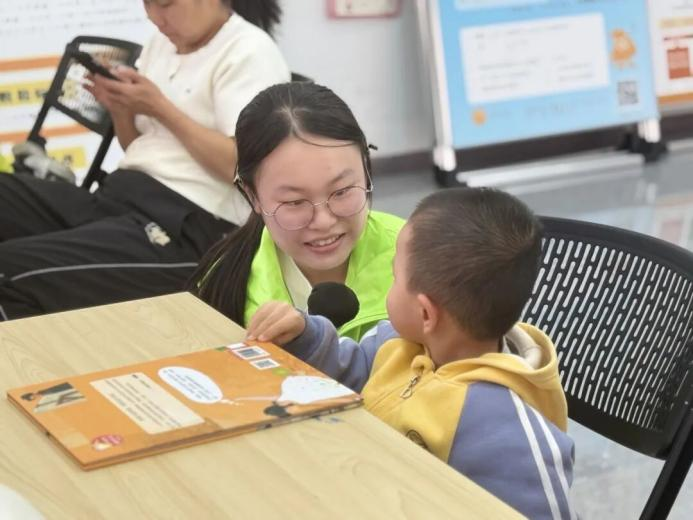 在随后的自由阅读环节,亲子家庭纷纷遨游在书海中。父母温柔的讲解声、孩子好奇的提问声此起彼伏,阅读角充满了温馨与求知的气息。