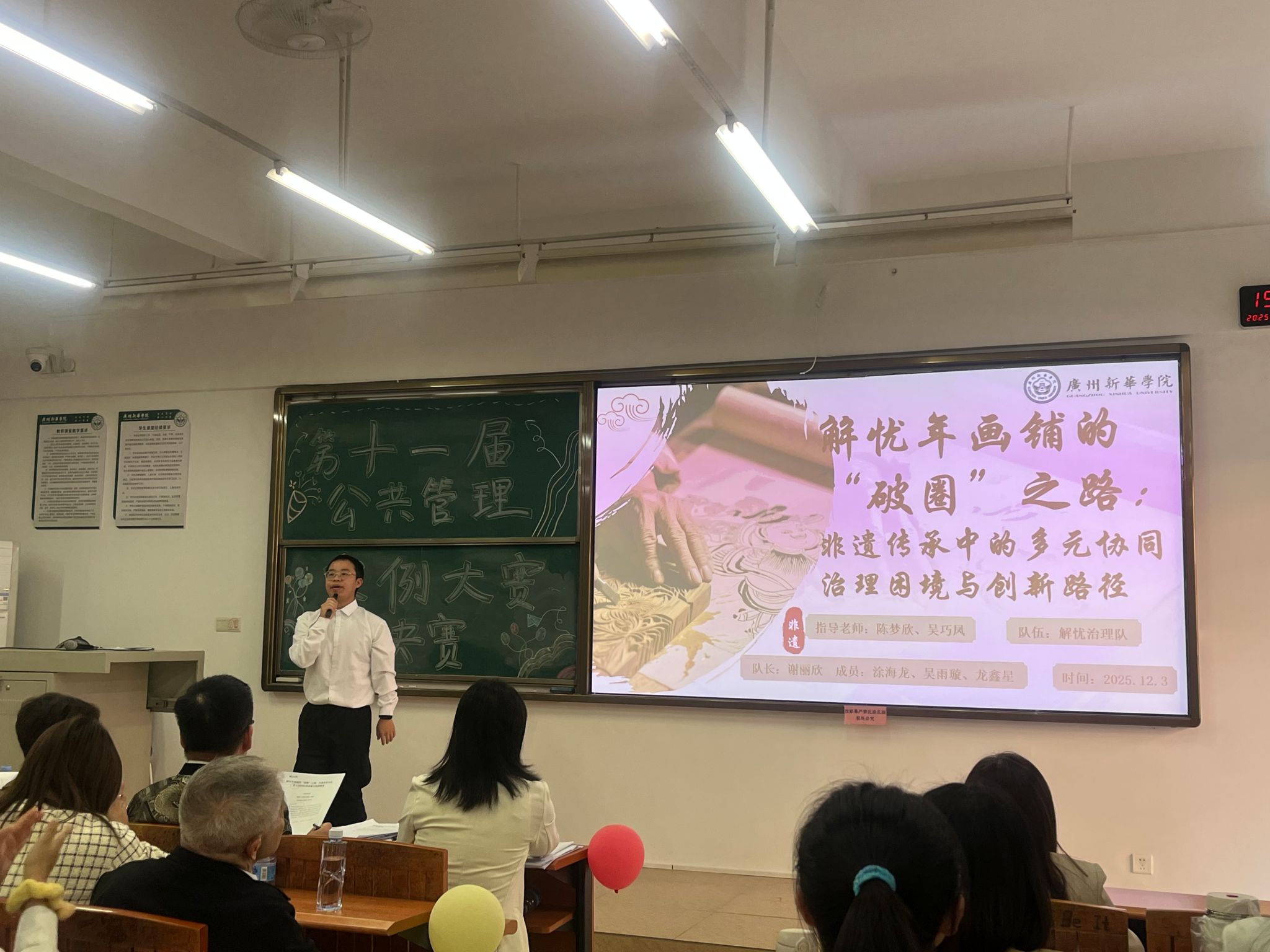 2025年12月3日,我校第十一届“公共管理案例大赛”圆满落幕。由我系2024级学生谢丽欣、涂海龙领衔,联合公共治理学院、会计学院同学组成的“解忧治理队”,凭借作品《解忧年画铺的“破圈”之路:非遗传承中的多元协同治理困境与创新路径》一举荣获大赛最高奖项——金奖。