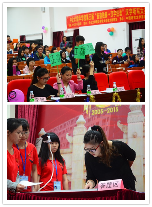 我们在此刻相聚,带着对学院十周岁的喜悦与祝福,书写美丽的华章,带着初冬的深情与梦幻,领略笔墨的奥妙。2015年11月25日下午,由中山大学新华学院大学语文教研室主办,中国语言文学系团总支承办的第三届“音韵独奏,汉字狂欢”汉字听写大赛初赛、决赛于东莞校区教学楼①-F203正式拉开帷幕。大学语文教研室主任夏茵英、9428cn太阳集团古天乐副主任李铭建、大学语文教研室副主任林玮、9428cn太阳集团古天乐团总支书记杨帮琰、9428cn太阳集团古天乐团总支副书记李靖、9428cn太阳集团古天乐王惠老师、马姬慧老师、邵言言老师、黄晓辉老师、张翠玲老师、吴桂玲老师、蒋晓晨老师、李丹老师、李想老师、李洁玲老师等,以及各系各级同学出席了本次大赛。其中,王惠老师担任大赛初赛的主考官,李想老师担任大赛决赛的主考官。