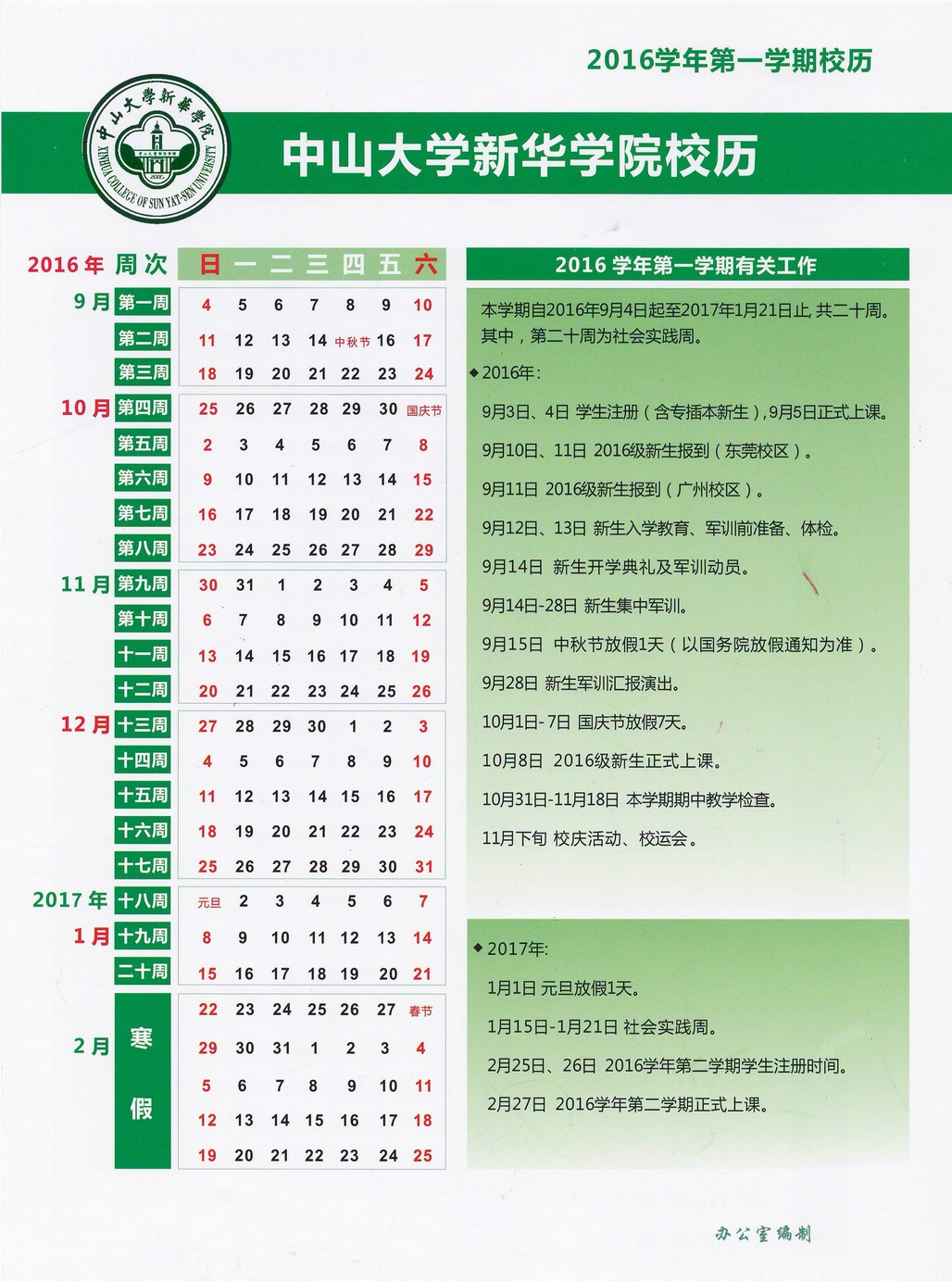 中山大学新华学院2016学年校历