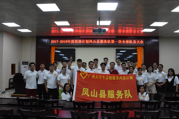 9428cn太阳集团古天乐毕业生积极投身国家基层就业项目,图为2017届毕业生林晓琳(前排右一)作为西部计划志愿者参加广西凤山县服务队会议