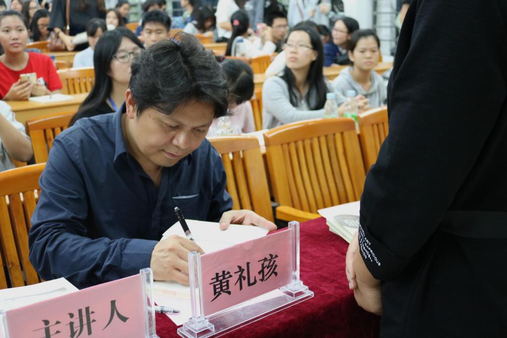 图三 诗人黄礼孩为我院图书馆和学生签书留念