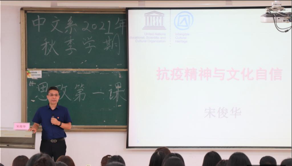 课堂伊始,宋主任讲解了当下“抗疫精神与文化自信”的背景。他指出,现在依然处于疫情防控的常态下,师生在个人防护上不可松懈。我校今年六月受到疫情封校的严峻挑战,也打了一场漂亮的抗疫战,而在新学期,师生们还是要时刻警惕“狼来了”,遵从我校防疫措施的安排。“抗疫精神”与“文化自信”,并不是“风马牛不相及”,它们有着实质性的内在联系——中国之所以能在国际抗疫中取得成功,离不开抗疫背后国人的文化自信,因此,我系学子要树立对家乡文化的自信以及对我校学校文化的自信,更重要的是,对中华民族优秀传统文化的自信。