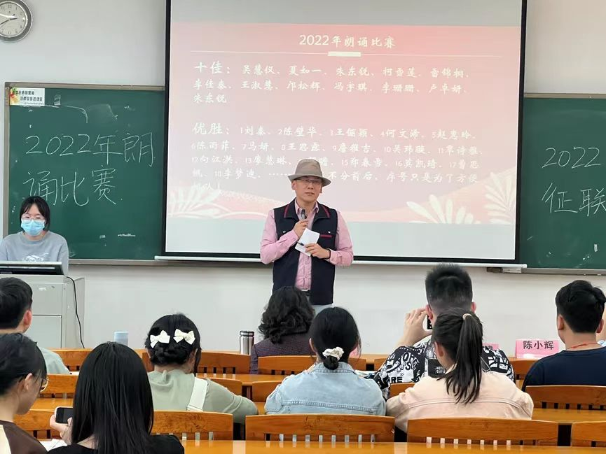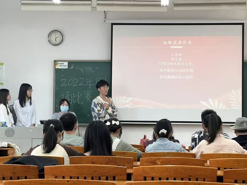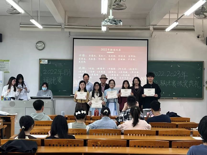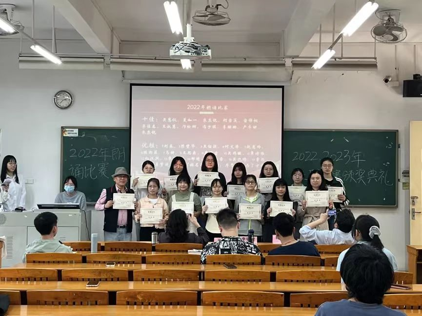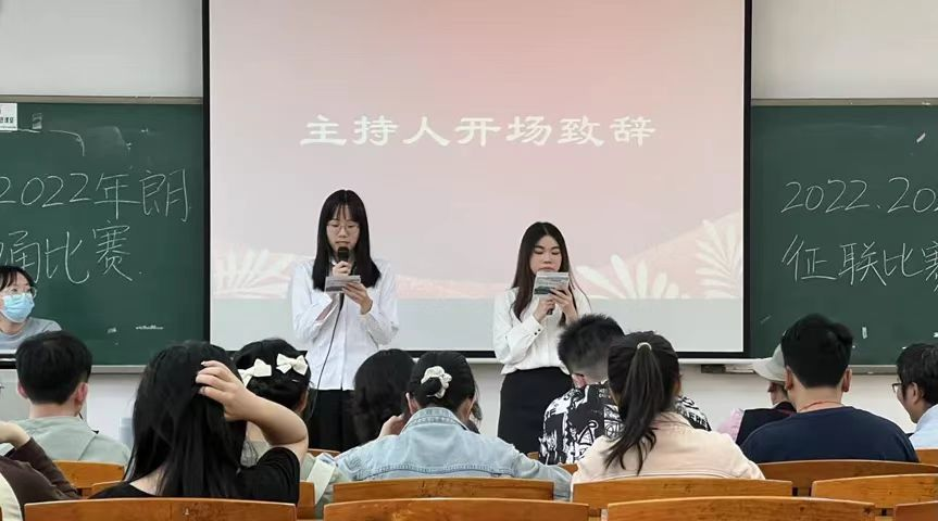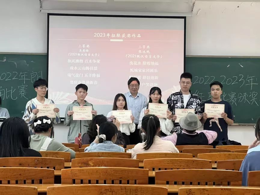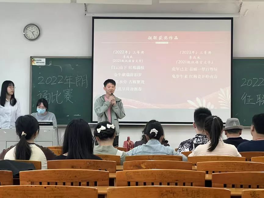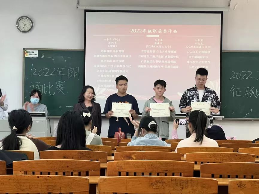 春风贺喜无言语,排比花枝满校园。万物复苏必有时,疫去安来春可期!在这疫情封控放开,万物复苏,天空沉静、草木萌动的三月,因受疫情影响而延迟的2022年朗诵比赛以及2022、2023年征联比赛颁奖典礼,于2023年3月8日下午三点十分在定静楼2-A205圆满落幕!