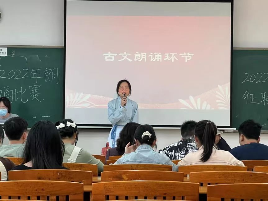 接着,便进行典礼的第二项流程,邀请2022级汉语言文学专业的吴慧仪同学上台朗诵《蜀道难》:“噫吁嚱,危乎高哉!蜀道之难,难于上青天!……”朗诵也如此,虽不及其十分艰难但亦有其三分,在朗诵过程中难免遇到瓶颈,在这个时候我们要有敢于去突破、挑战的精神,只有去尝试才能有所收获!