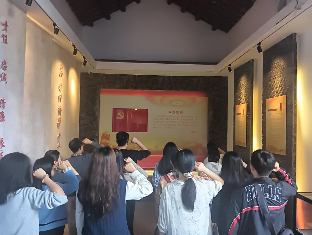 活动第二站为河源市阮啸仙故居。阮啸仙同志是中国共产党第一批党员,杰出的无产阶级革命家,中国共产党纪检监察工作先驱,人民审计事业奠基者。故居内的实物展品、图片资料和文献资料详实,不仅让大家对阮啸仙同志的事迹有了更直观的认识,还让大家深刻感受当时的革命氛围。在闻啸轩学堂旧址内,党员同志们在程露书记的带领下,整齐列队,举起右手,在党旗下重温入党誓词。誓词虽短,但字字千钧。通过重温誓词,党员同志们回顾了入党时的初心和使命,坚定了为党的事业终身奋斗的信念。