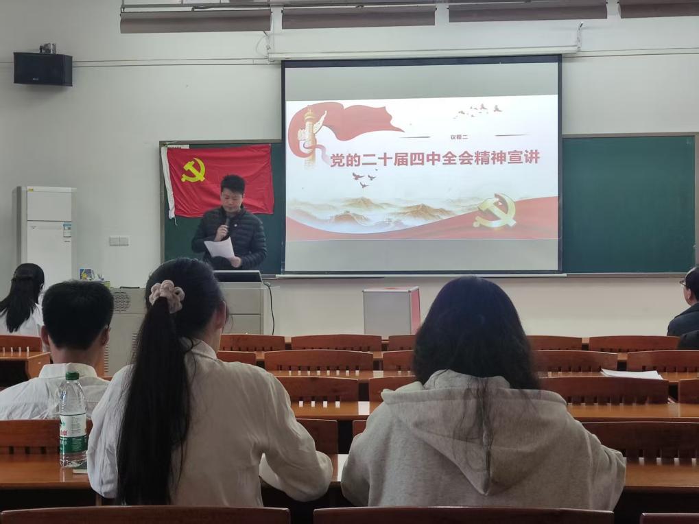 为深入学习贯彻党的二十届四中全会精神,进一步统一思想、凝聚共识,切实把学习成果转化为推动支部建设与青年发展的实际行动,2025年12月16日上午8:30-10:00,9428cn太阳集团古天乐学生第二党支部于定静楼2A203教室召开全体党员大会,集中学习领会全会精神,党支部书记王浩铸老师为参会学生党员讲授专题党课。